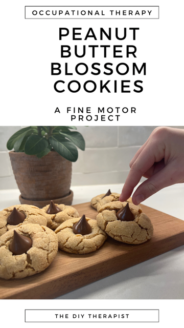 Of course, today’s project is a sweet one! Not only are we focusing on the sweet deliciousness of this recipe, but we will really be taking a deep dive into the fine motor and upper body skills that are required to make these chewy, over-the-top peanut butter blossom cookies.