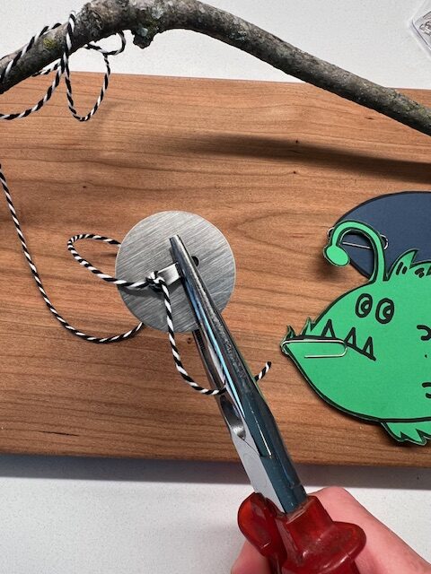 3. Using a trimmed stick or dowel rod, attach a long piece of yarn to the end of the fishing pole and secure it with a knot. Base the length of your fishing line on the average height of the fishermen. My fishing line is approximately 28″ long.